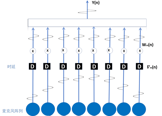 假設麥克風的數(shù)量為M,第i個麥克風接收到的信號為,對進行時延對齊后,累加可得