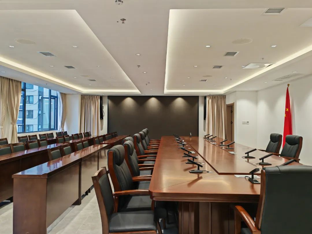 有線話筒無需充電續(xù)航,保證高層重要會(huì)議長時(shí)間穩(wěn)定進(jìn)行,會(huì)議屏幕兩側(cè)選用豪華型線性音柱定向擴(kuò)聲,搭配天花板上方的天花喇叭,讓室內(nèi)音效達(dá)到最佳狀態(tài),整間會(huì)議室盡顯莊重、大氣。