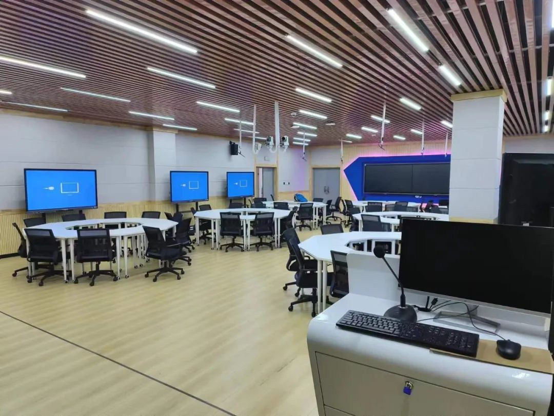 通過智能中控系統(tǒng),能一鍵開啟教室的聲光電等設(shè)備,例如打開電源、燈光照明、電動(dòng)窗簾等,操作簡單,十分便捷。另外教室還采用了世邦擴(kuò)聲音箱,會(huì)議發(fā)言系統(tǒng)含有線話筒和無線手持話筒,是科技感十足的現(xiàn)代化智能多媒體教室。