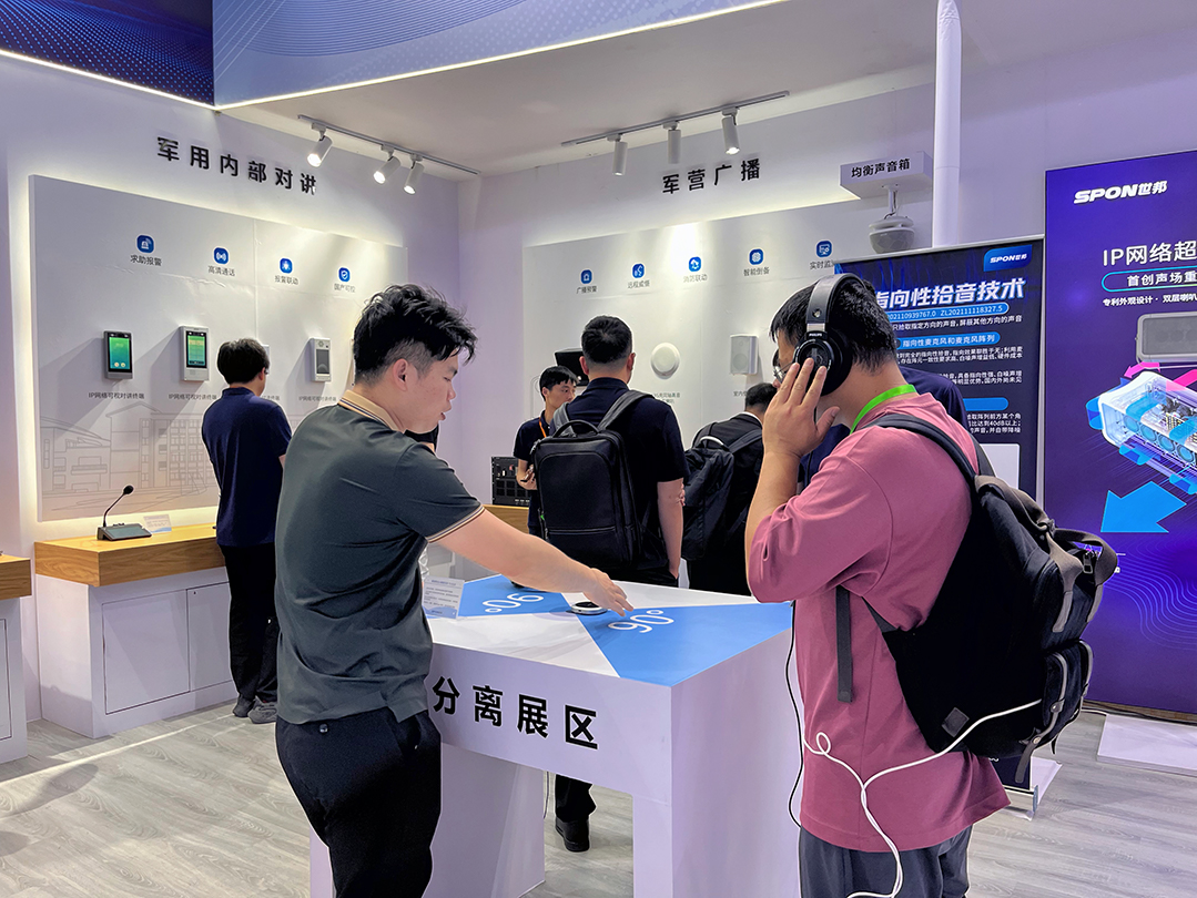 展會首日,世邦展臺吸引了眾多參展客戶,世邦提供以音頻為核心的解決方案,并展示了多項自研技術,支持根據(jù)具體場景實施落地方案,全國產(chǎn)化音頻智能物聯(lián)解決方案,助力國防領域國產(chǎn)化自主率提升。參展客戶紛紛蒞臨展臺,現(xiàn)場感受世邦產(chǎn)品帶來的真實效果,并詢問核心技術的場景延展應用。
