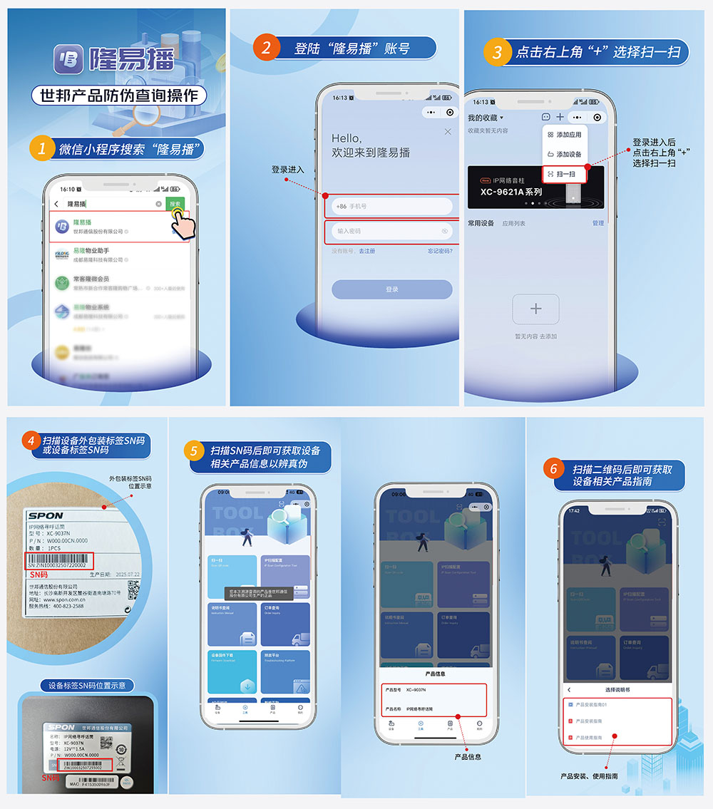 您可以通過手機(jī)微信搜索并打開 “世邦隆易播”小程序,使用小程序內(nèi)的“掃碼”功能,掃描產(chǎn)品標(biāo)簽上的 SN碼,即可快速、準(zhǔn)確地查詢產(chǎn)品的真?zhèn)涡畔⒓吧a(chǎn)溯源信息,有效保障您的權(quán)益。