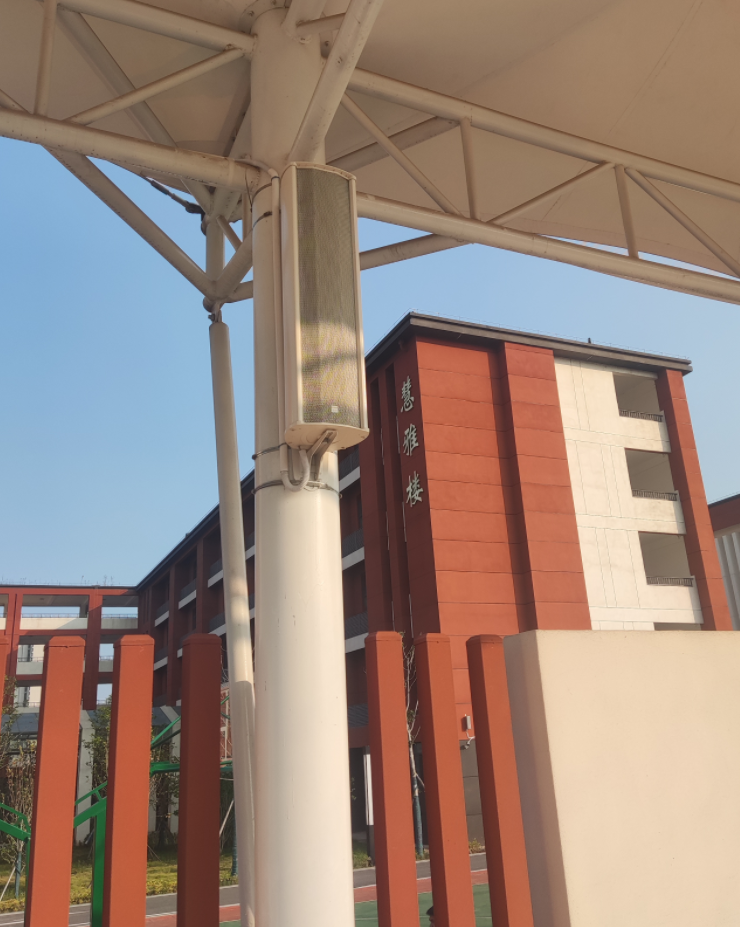 · 室外空間(立桿安裝): 室外環(huán)境背景噪聲大且單點覆蓋要求廣,通常將防雨音柱附著于路燈桿或?qū)S帽O(jiān)控立桿上。 安裝高度通常規(guī)范在 3.5米至4.5米 之間(大功率號角5米以上)。此高度不僅能避開貨車或工程車輛的刮擦、防止人為破壞,還能通過配合適宜的下傾角,實現(xiàn)更遠(yuǎn)距離的有效聲場覆蓋。